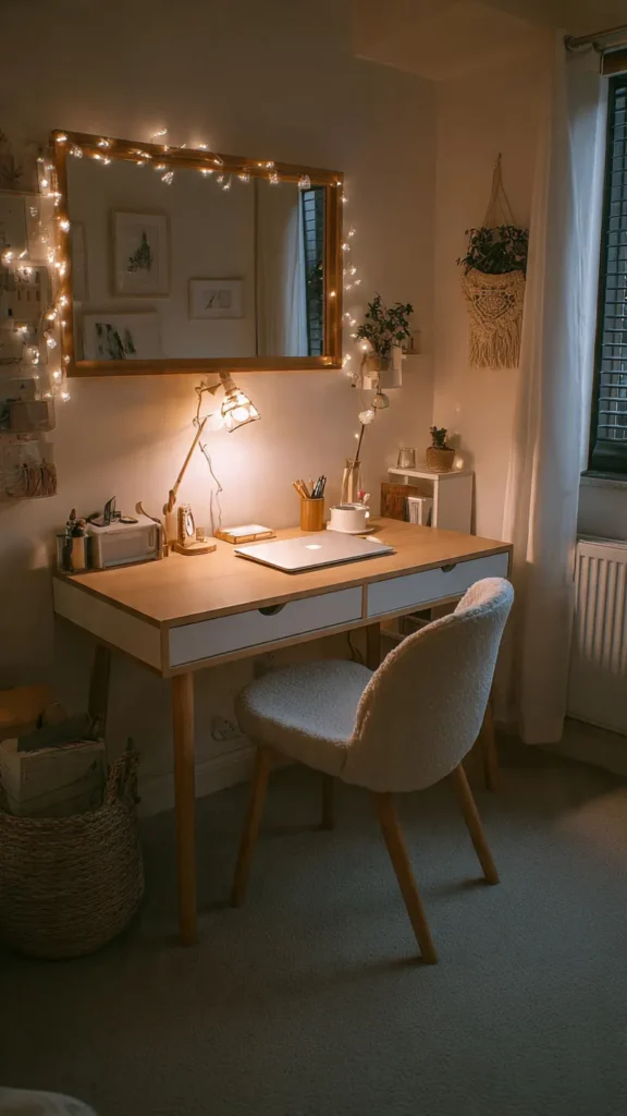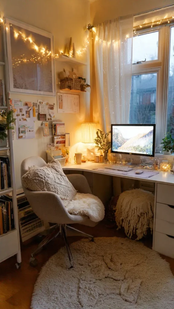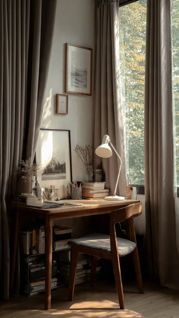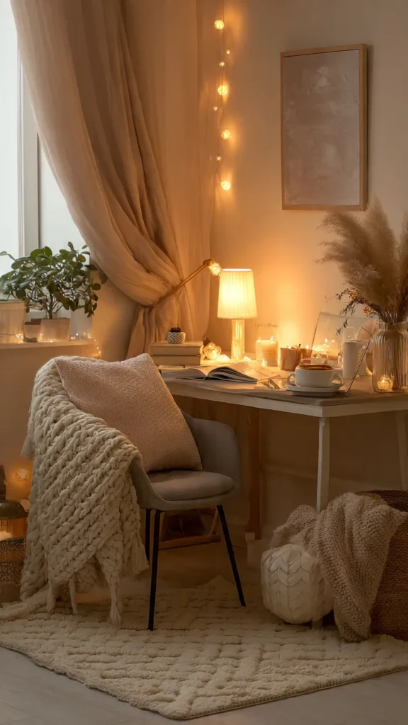 Turn an unused corner into a cozy workspace using soft textures and warm elements. A small desk, layered with a comfortable chair cushion, throw blanket, and a soft rug can completely transform the feel of the area. Add warm lighting like a table lamp or fairy lights to make the space inviting. This idea is perfect for those who want their workspace to feel more relaxed and home-like.