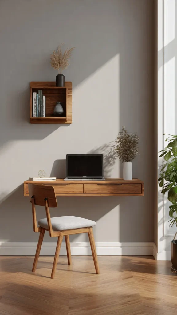 A floating desk mounted directly to the wall is perfect if you have very limited space. It takes up almost no floor area while still providing a functional work surface. Pair it with a stool or compact chair that can be tucked underneath when not in use. Keep the styling minimal with just a lamp and a small decor item.