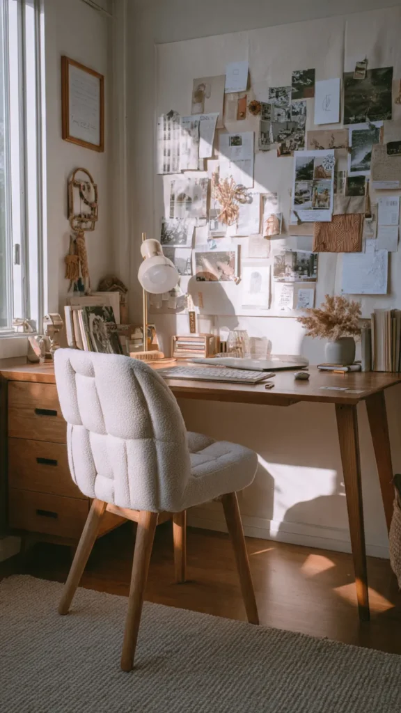 A vision board keeps you motivated and organized at the same time. It combines function with decor, making your workspace feel more personal without requiring expensive items.