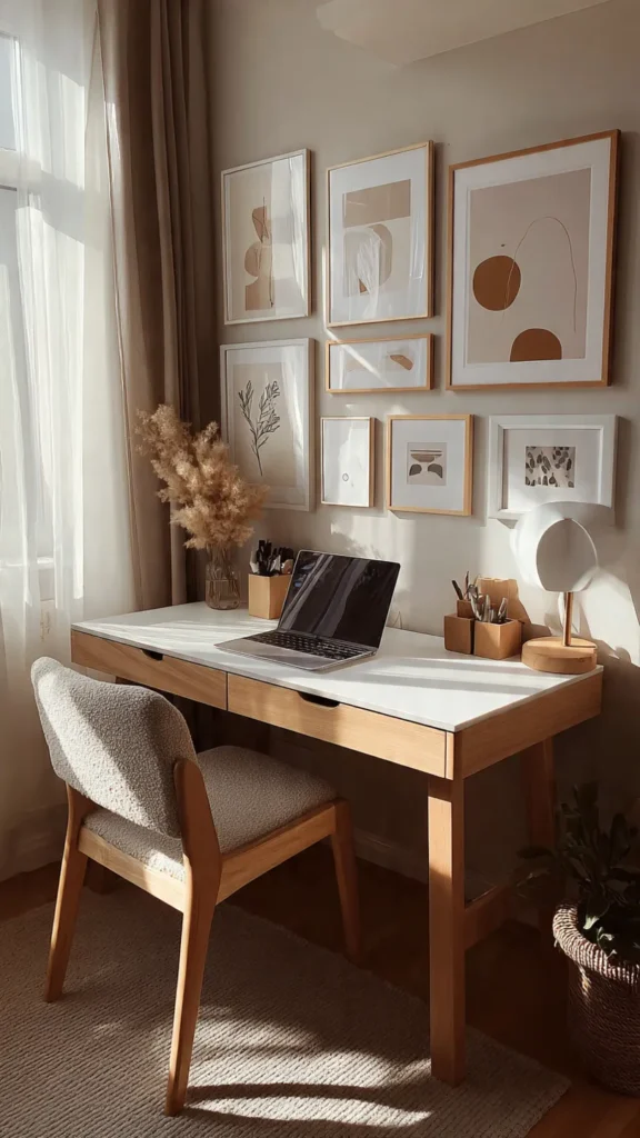 Your background plays a big role in how your workspace feels—and looks, especially for video calls. Adding a simple neutral curtain or fabric backdrop behind your desk can instantly elevate the aesthetic. It hides any cluttered areas and creates a clean, cohesive look. Choose light, airy fabrics like cotton or linen in shades like beige, white, or soft grey.