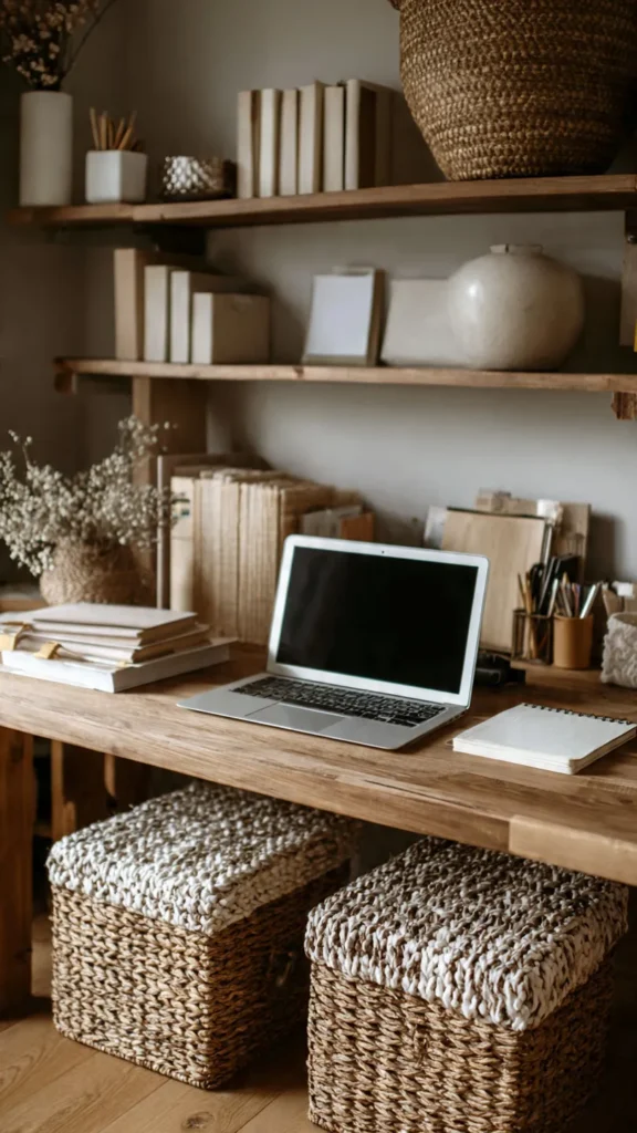 Keeping your desk surface clean is easier when you have proper storage below it. Use baskets or storage bins under your desk to store files, chargers, or extra supplies. Woven baskets or fabric bins not only hide clutter but also add texture and warmth to your workspace.