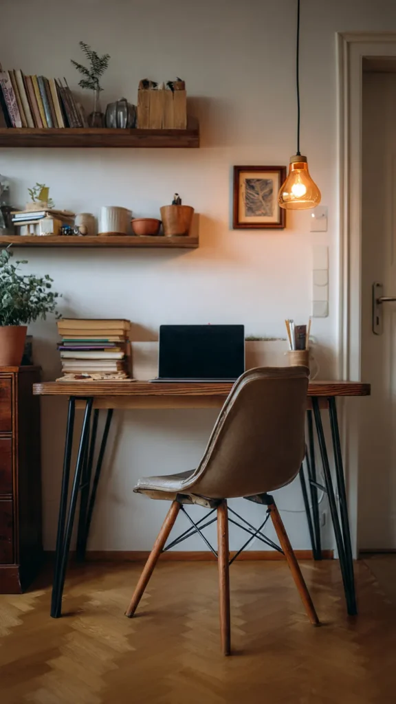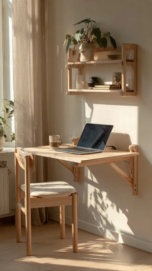 A foldable desk is a smart solution for small homes where space is limited. You can easily set it up during work hours and fold it away when not in use, making your room feel less crowded. Pair it with a lightweight chair that can be moved around easily. Add a small desk mat, a notebook, and one decorative piece like a plant or candle to keep the setup minimal yet visually pleasing.