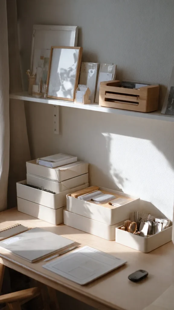 Every desk has small clutter—chargers, receipts, stationery, random notes. Instead of letting them pile up, use 1–2 small storage boxes to contain everything. Place them on one side of your desk or a nearby shelf. Choose simple boxes (cardboard, wooden, or plastic) in neutral tones to maintain a clean look.