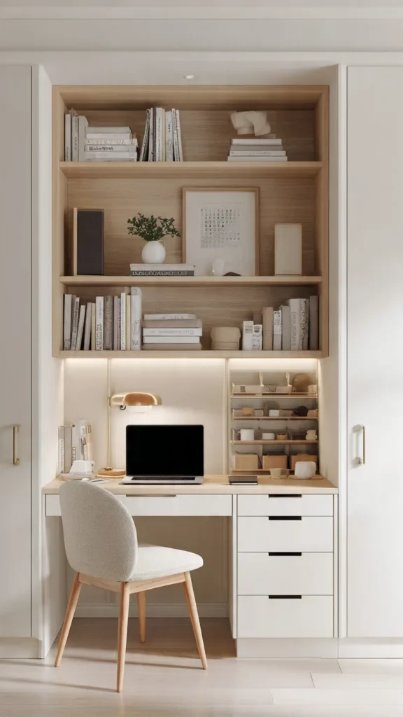 A clean and minimal desk setup can instantly make your home office feel calm and distraction-free. Stick to neutral shades like white, beige, and soft grey to create a soothing atmosphere. Use a simple wooden or white desk paired with a comfortable chair, and avoid clutter by keeping only essentials visible. Add a small desk lamp and a notebook organizer for a polished yet functional look. This setup works especially well for small spaces and keeps your mind focused on work.