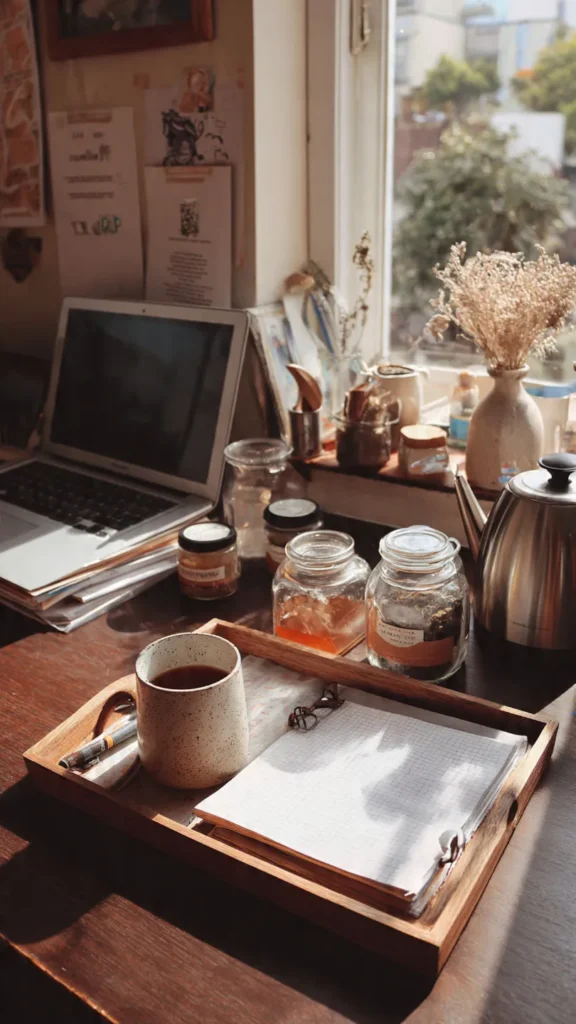 Create a workspace that feels “ready to use” at all times by keeping an open notebook or diary on your desk. Place a pen beside it, your laptop slightly angled, and maybe a sticky note pad nearby. This gives your desk an active, in-use look rather than a staged one. It also helps you quickly jot down ideas, tasks, or reminders without breaking your workflow.