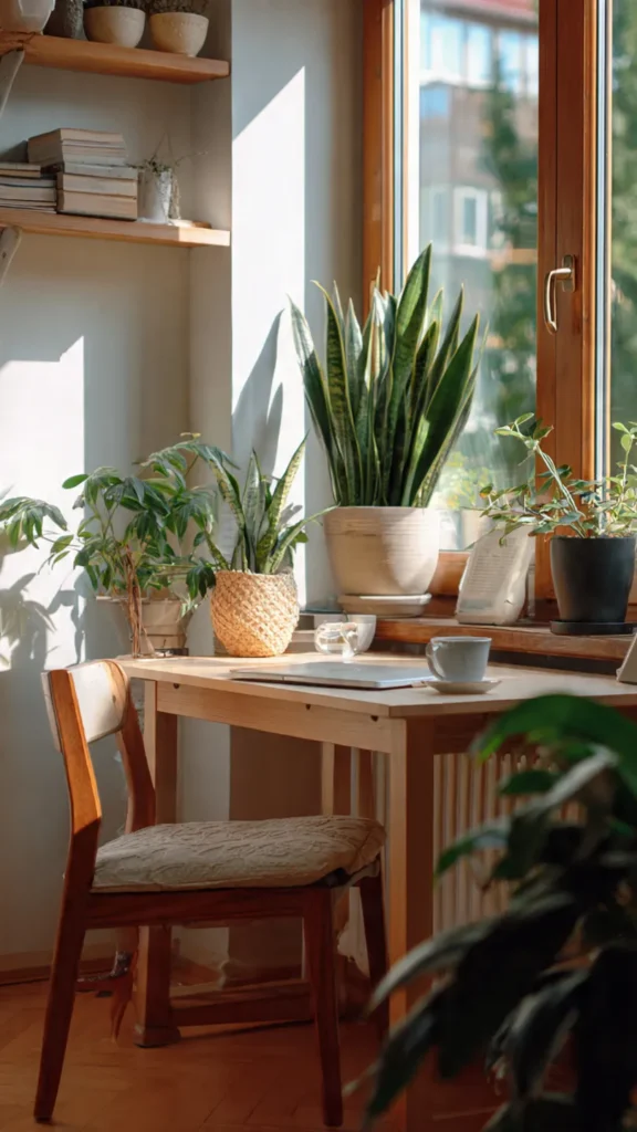 Bring life into your home office by adding indoor plants. Even one or two small plants can make a huge difference in how your workspace feels. Choose low-maintenance options like snake plants or pothos, and place them on your desk or shelves. Pair them with natural materials like wood or jute for a fresh and earthy aesthetic.