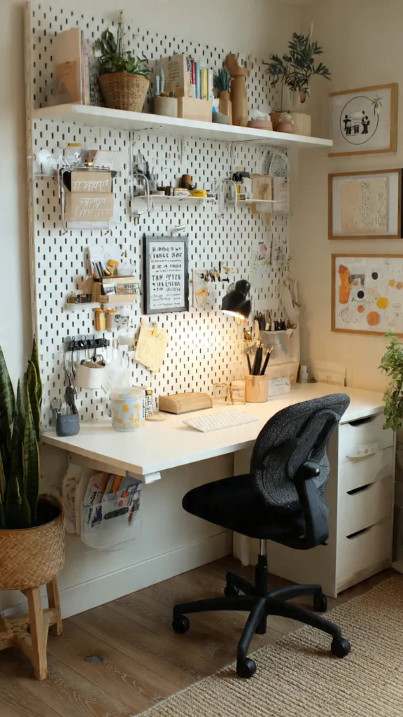 A pegboard keeps everything organized without cluttering your desk. It’s highly customizable and affordable, allowing you to change the layout whenever you want. This flexibility makes it perfect for small spaces and evolving needs.