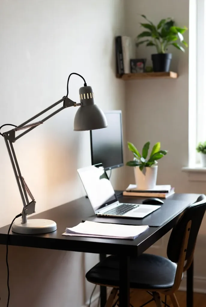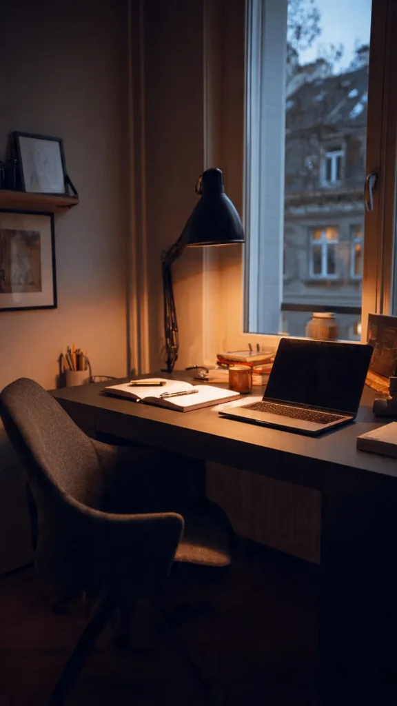 Instead of decorative lighting only, focus on a proper working light setup. Place a desk lamp on one side, your laptop in the center, and your writing area on the opposite side. This creates a clear division between digital and manual work. The lighting should directly support your work, not just look pretty.