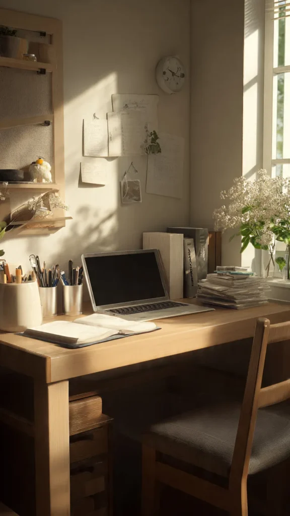 A realistic home office starts with a desk that actually supports your daily routine. Instead of over-decorating, focus on placing your everyday essentials neatly—your laptop, a pen holder, a diary or planner, and a small box for random items like clips or USBs. Keep everything within reach so you don’t have to constantly get up while working. Add one small aesthetic touch like a plant or a simple lamp to keep it visually balanced.