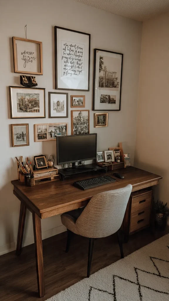 A gallery wall makes your workspace feel personal and motivating. It’s one of the most budget-friendly decor ideas since you can DIY most of it. Plus, it adds visual interest without taking up any desk space.