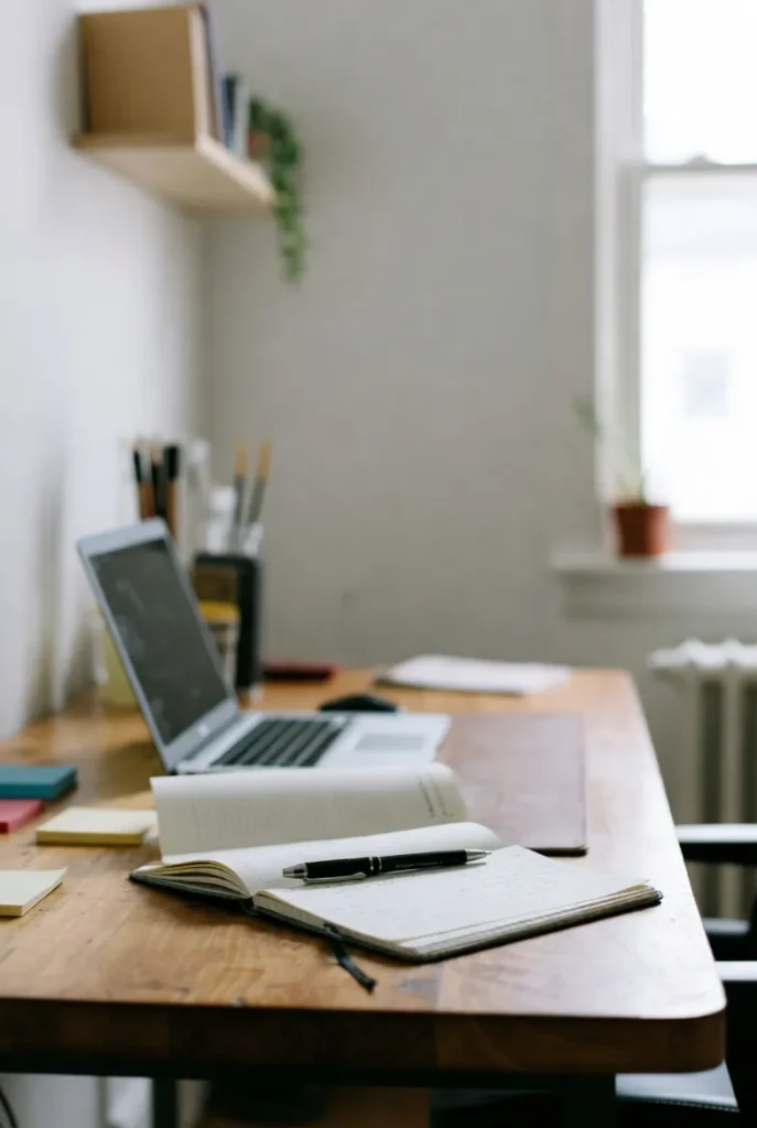 Design your workspace in a way that’s easy to reset at the end of the day. Keep a designated place for everything—pens in a holder, diary stacked neatly, laptop in the center, and loose items stored in a box or drawer. This makes cleaning up quick and helps you start fresh the next day.